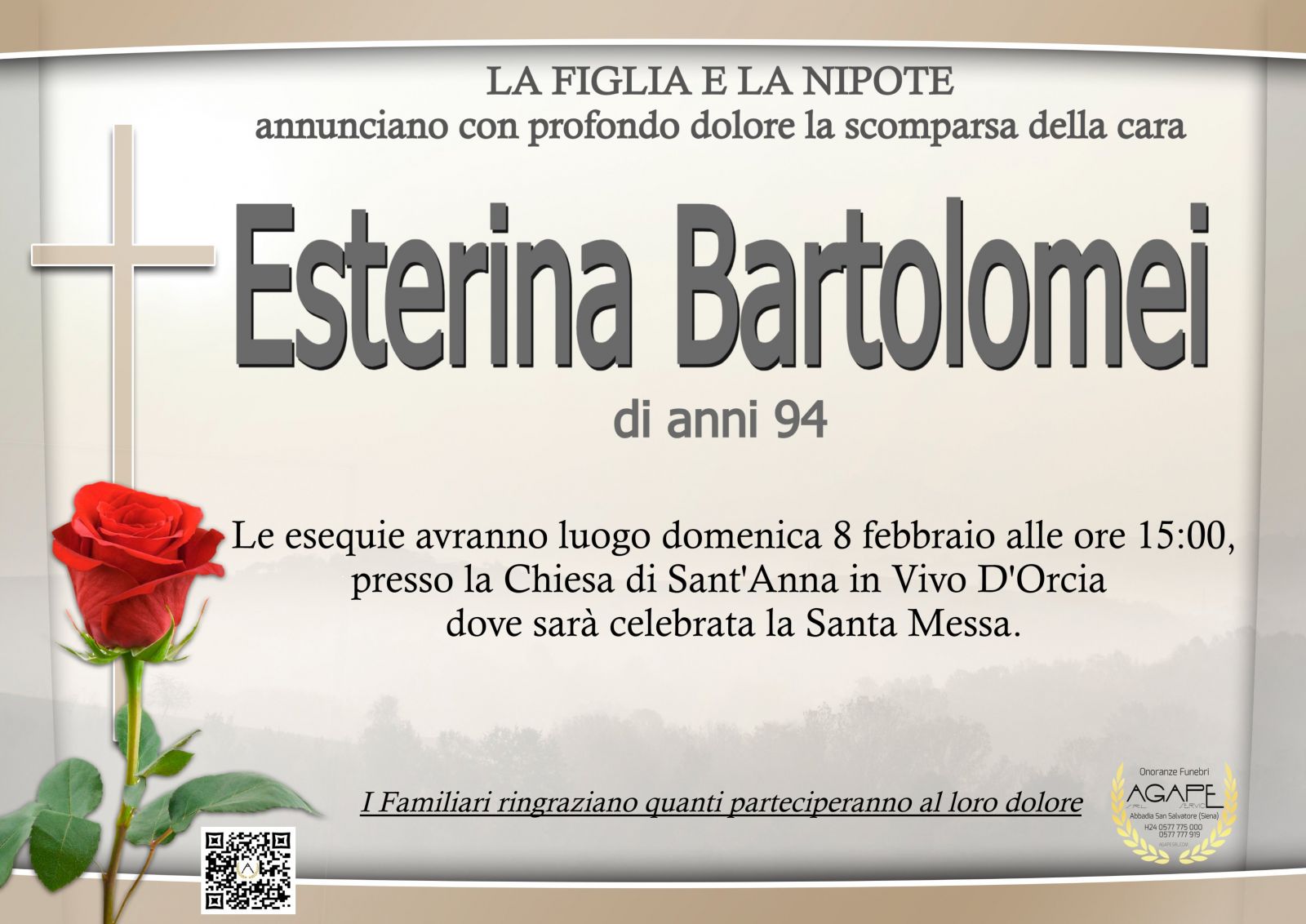 Lascia gratuitamente un messaggio di cordoglio, sarà nostra cura consegnarlo ai congiunti di Esterina Bartolomei.